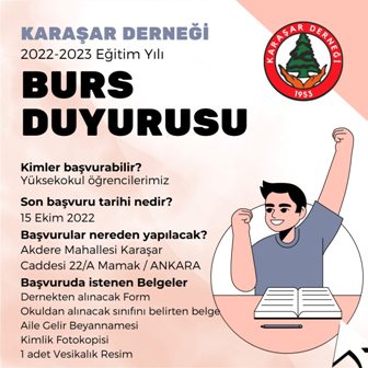 KARAŞAR KÜLTÜR VE YARDIMLAŞMA DERNEĞİMİZ TARAFINDAN YÜKSEKOKUL ÖĞRENCİLERİMİZE EĞİTİM YARDIMI İÇİN BAŞVURUDA BULUNACAK ÖĞRENCİLERİN DİLEKÇE İLE DERNEK MERKEZİMİZE BAŞVURMALARI GEREKMEKTEDİR.